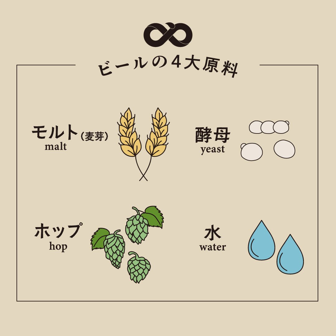 ビールの4大原料は、「モルト(麦芽) / malt」 「酵母 / yeast」「ホップ / hop」「水 / water」です。