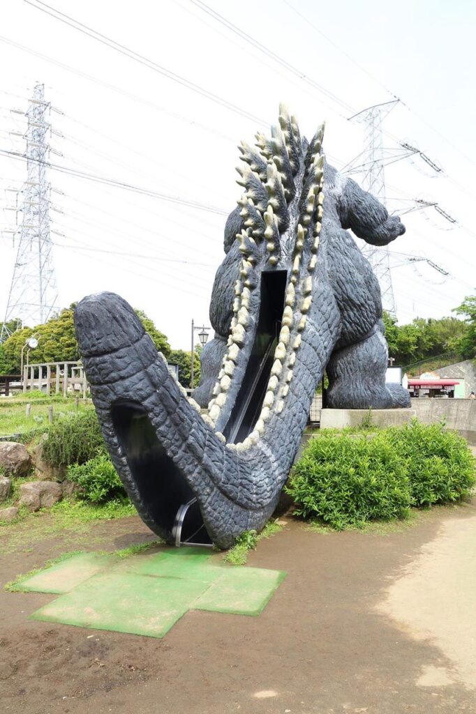 親子族群也可前往「冒險樂園區」,體驗大型遊具設施,其中最受歡迎的就是「哥吉拉溜滑梯」——全長10公尺的經典造型,從牠的肚子一路滑到尾巴。