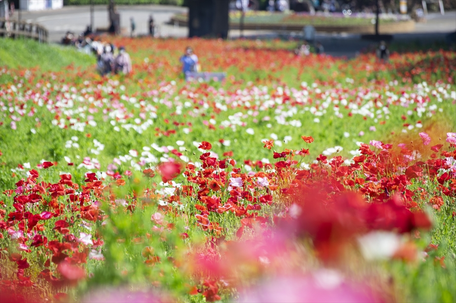 遊客可沿著景觀步道悠閒漫步,欣賞隨風搖曳的花海。溫暖調性的虞美人花與清涼色調的琉璃唐草交織出鮮明的對比,完美展現春日氛圍,是自然愛好者與攝影迷的必訪勝地。