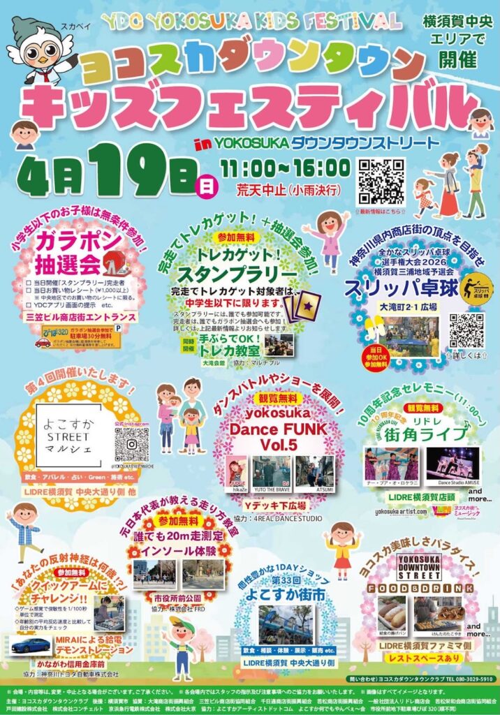 橫須賀中央兒童嘉年華 2026(Yokosuka Downtown Kids Festival 2026)將於 2026 年 4 月 19 日星期日在橫須賀中央一帶舉行。活動時間為 11:00 至 16:00,會場分布於市中心多個地點,包括 Y Deck 下廣場、市役所前公園、LIDRE 橫須賀,以及神奈川信用金庫本店營業部前一帶。活動遇小雨照常舉行,荒天取消。