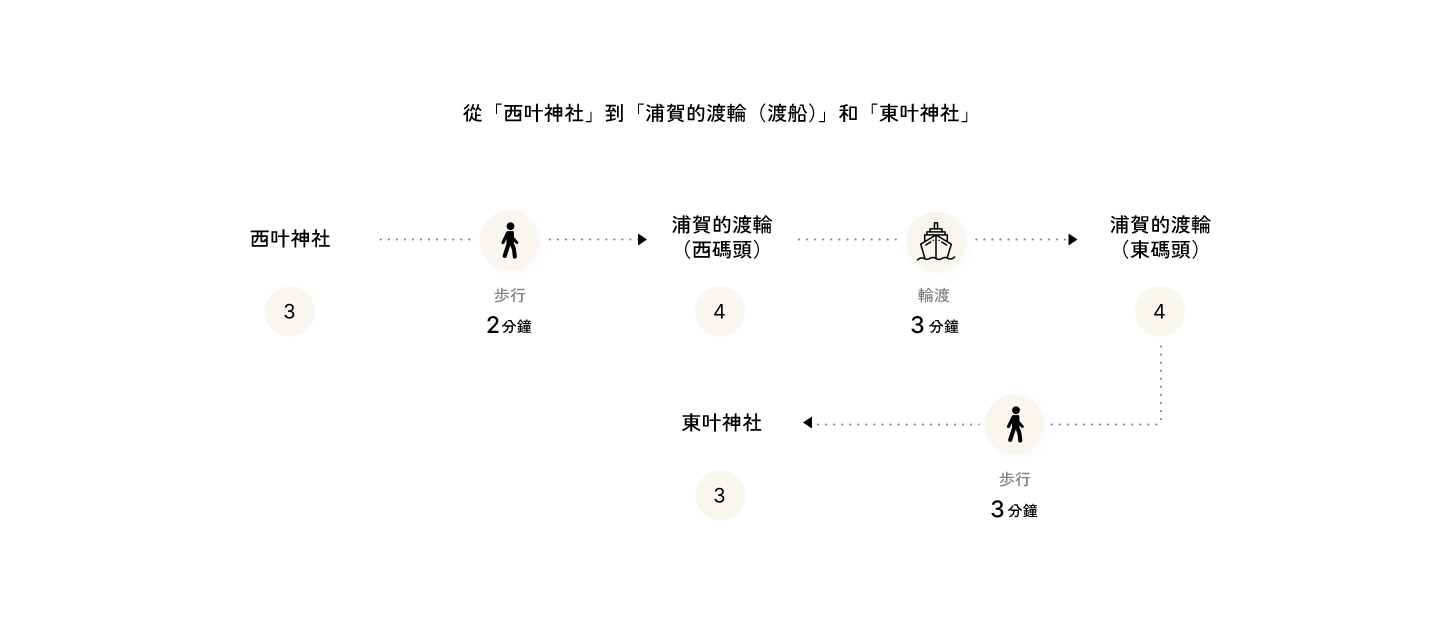 1725年,浦賀地方長官辦公室成立後,這艘標志性的渡輪成為了那些穿越浦賀港東部和西部的人的定期通勤路線。這趟行程約3分鐘,乘客可以看到浦賀造船廠的起重機和碼頭的遺跡。