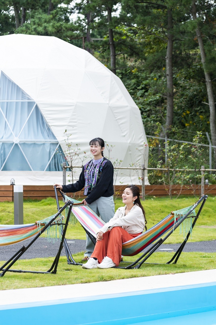 入住後, 就一邊欣賞絕景一邊在帳篷中悠哉放鬆, 或到泳池畔吹著海風享受閱讀, 亦可到圓筒型的戶外三溫暖充充電。