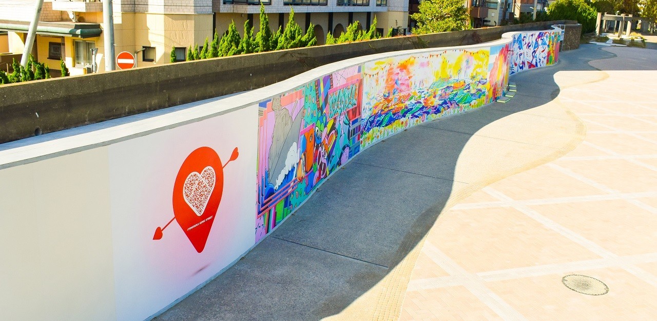 這是以【從「YOKOSUKA」向「世界」發送「LOVE」】為主題, 長 50 公尺、「擁有最強精華」的好拍牆面藝術,位於 JR 橫須賀車站到觀音崎、向沿海延伸約 10 公里的步道「10,000 公尺長廊 (海風之路)」上,三笠公園到海風公園之間的步道。