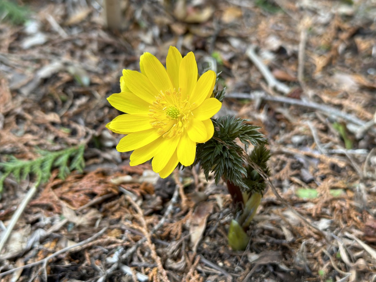 山上門跡の手前にはフクジュソウ(学名 Adonis ramosa)という植物が生えています。フクジュソウは早春に黄金色の花を咲かせることから、
